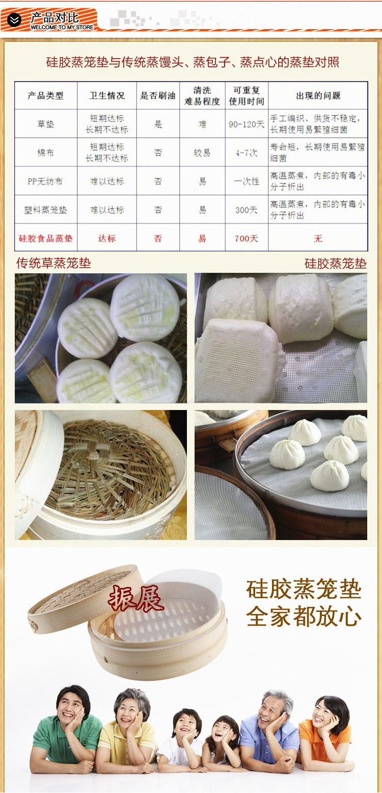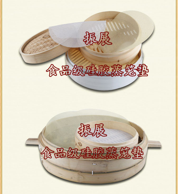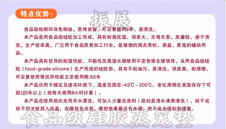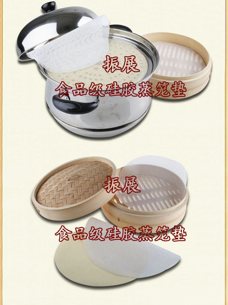 使用方法:使用前應(yīng)先用開水漂洗,可加入少量洗滌劑清洗,清洗完畢后晾干才能放入托盤;在擺放包點(diǎn)前,要使硅膠蒸籠墊表面沒有水滴,就不會(huì)出現(xiàn)粘包現(xiàn)象。